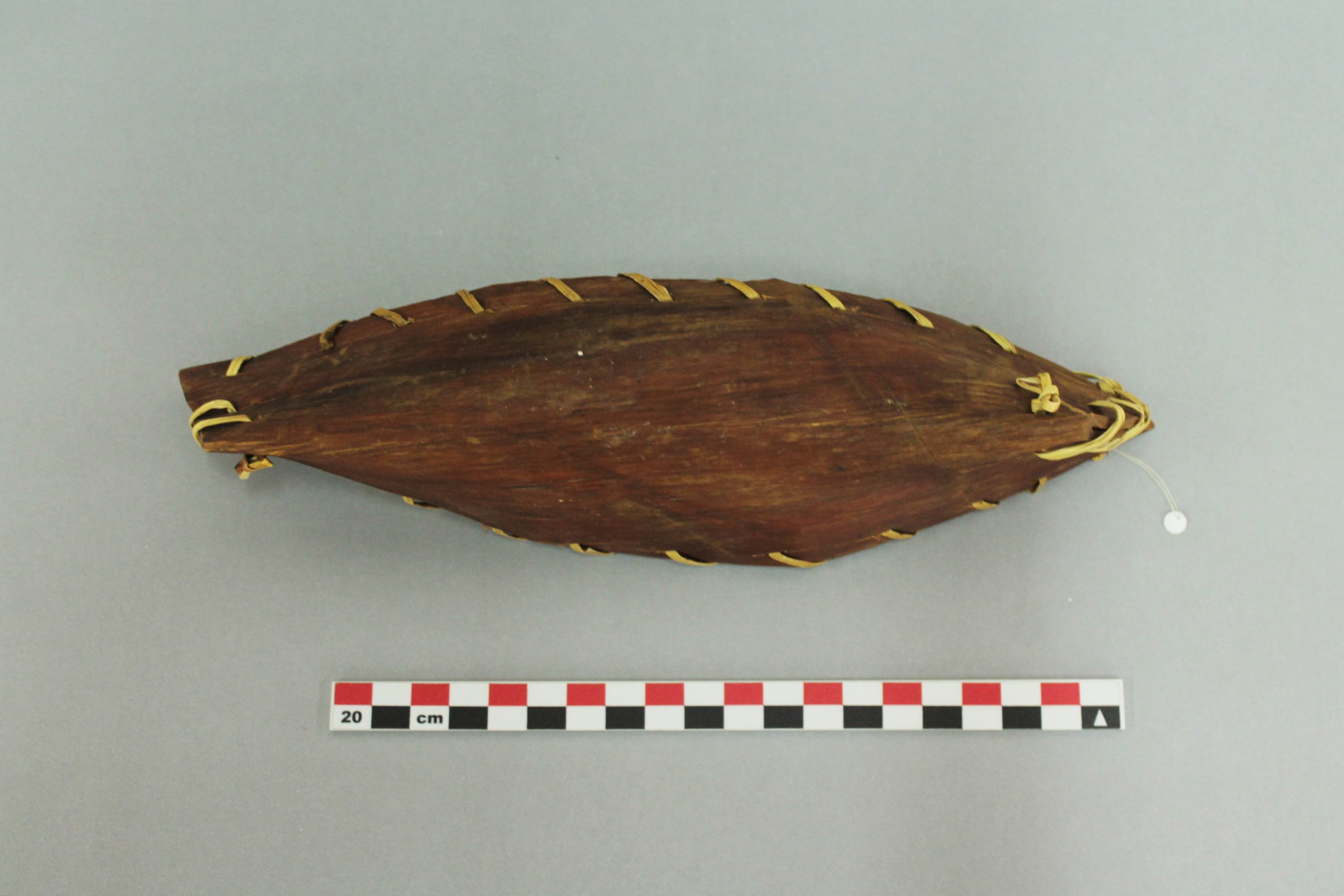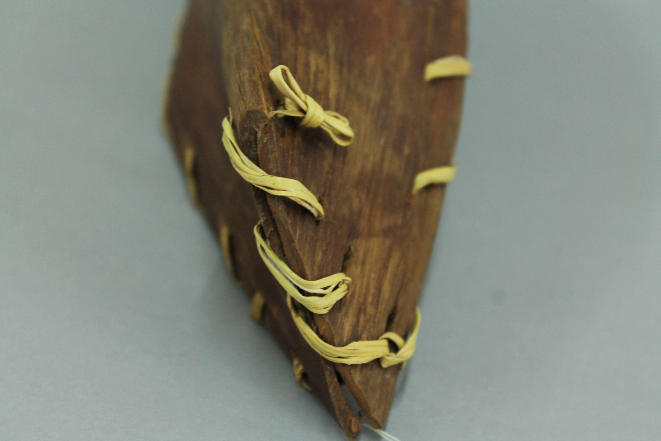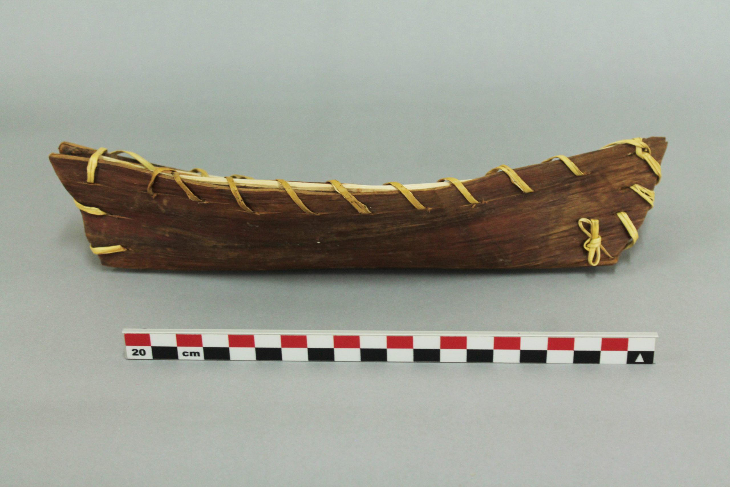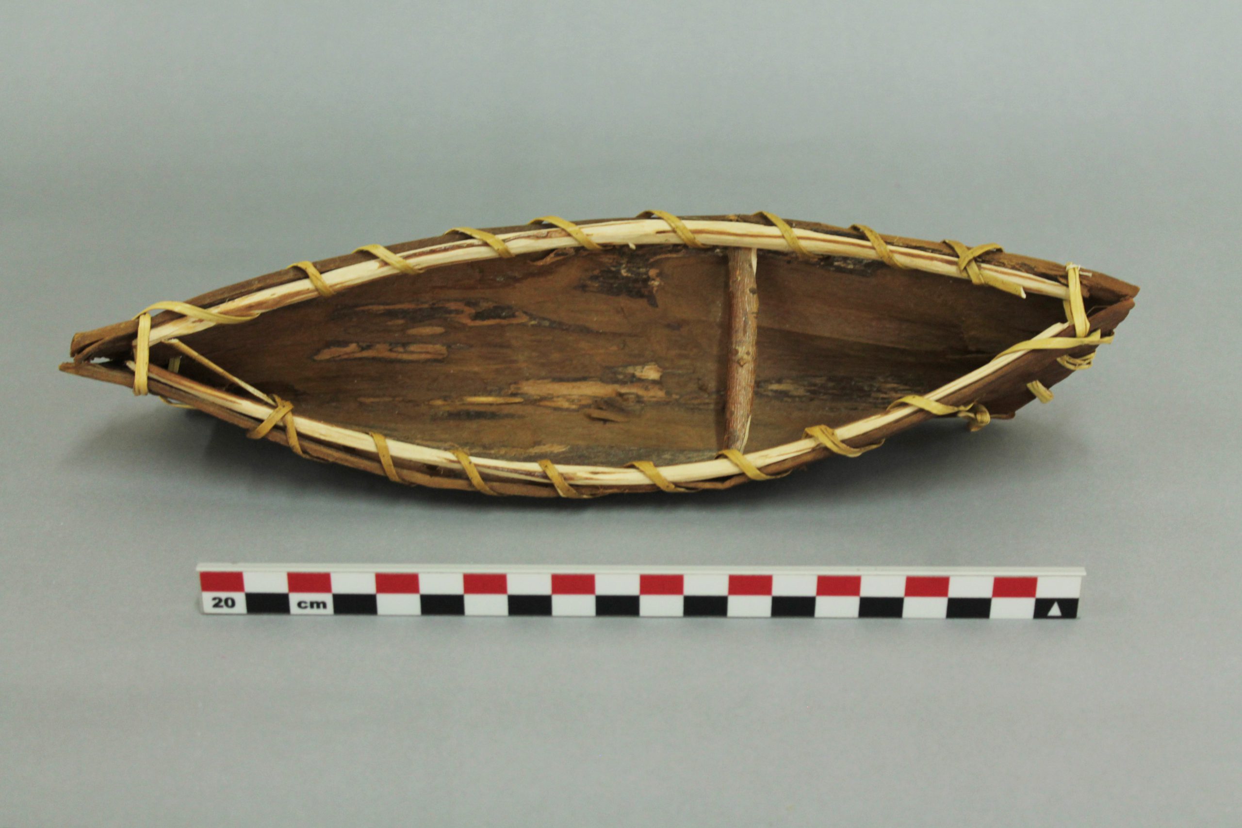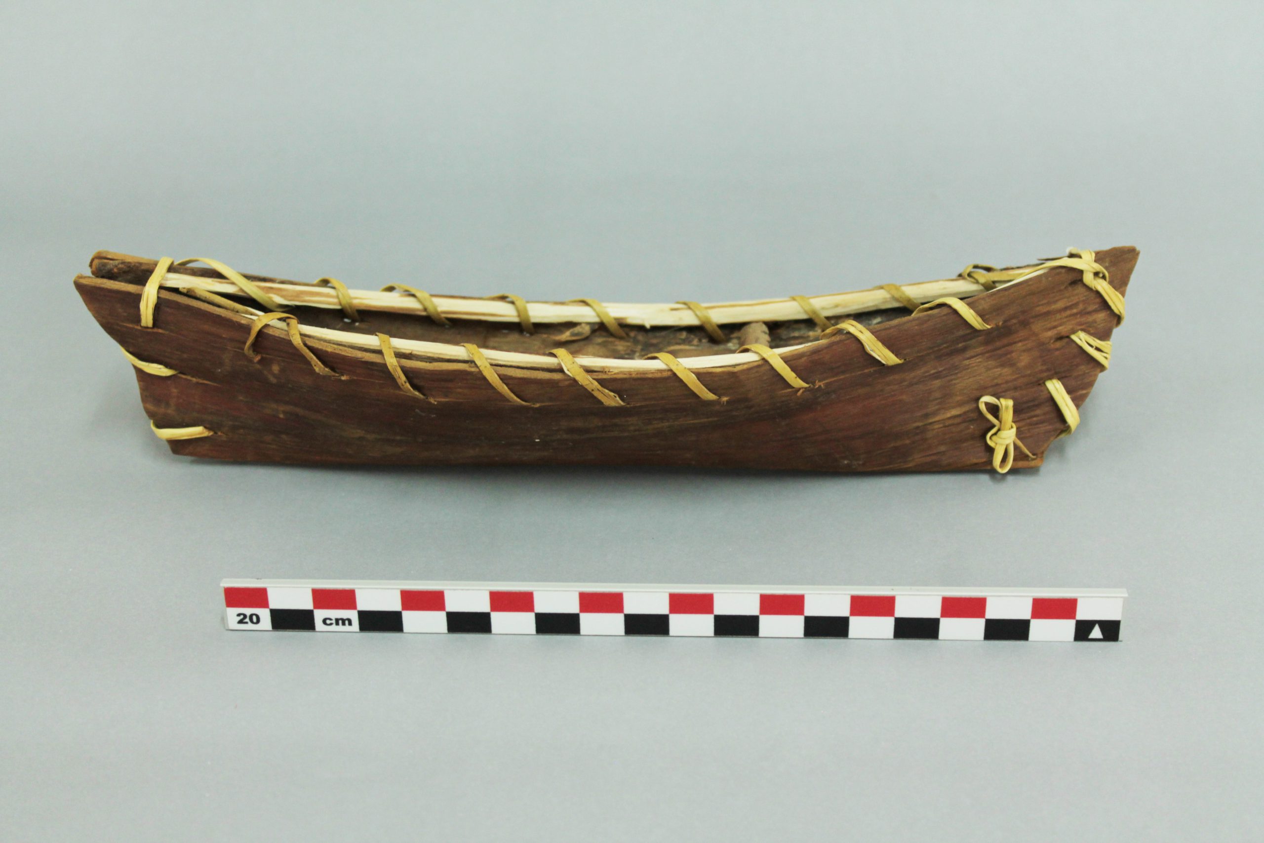 Modelo de embarcación tradicional yagán, construida con una sola plancha de corteza plegada y cosida con junco (una central y dos laterales, cosidas entre sí con filamento de polímero (fleje de embalaje). Presenta dos varas de madera, cada una en los bordes superiores de la embarcación, y una (1) varilla transversal.